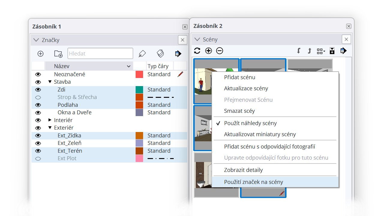 Číst více ...Pokud někdy pracujete ve SketchUpu s organizačně složitějšími modely a používáte více Scén i Značek, může Vám tato nová funkce verze 2025 ušetřit hodně klikání!