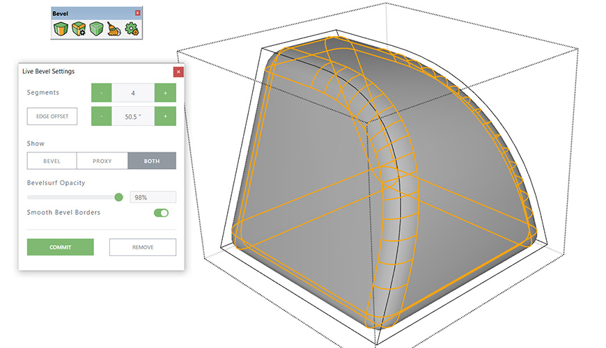 Bevel je rozšiřující plugin určený pro snadné zaoblení nebo zkosení hran modelu SketchUpu. Je rychlý, výkonný a velmi snadno ovladatelný. Je doslova radost ho používat, zvláště pokud jste pro vytváření zaoblení dosud využívali pouze nativní nástroj SketchUpu Tažení profilu po dráze (Follow Me).