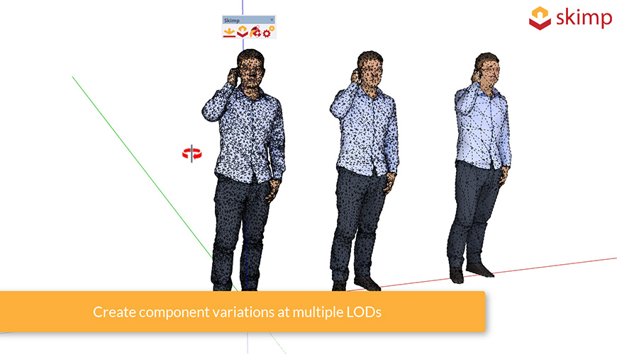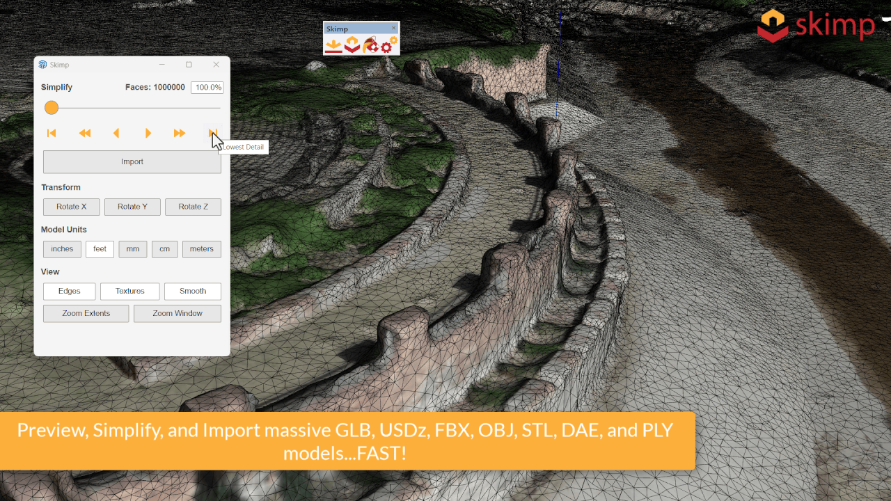 Skimp je ultimátní rozšiřující plugin pro import a redukci polygonů ve SketchUpu pro profesionály. Dokáže nahradit několik stávajících nástrojů a aplikací. Umožňuje importovat formáty OBJ, FBX, SKP, STL, 3DS, GLB, USD, DAE, PLY a VRML, následně je datově zmenšit – zjednodušit na úrovni počtu polygonů a obsahuje i šikovný nástroj pro snadnou výměnu a nahrazení textur a materiálů Vašeho modelu.