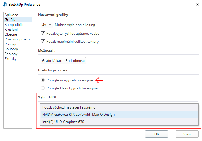 Výběr grafického enginu a konkrétní GPU je dostupný z horního roletového menu Dialogová Okna / Preference pro Windows nebo SketchUp / Preference pro Mac OS a tam v levém sloupci položka Grafika.