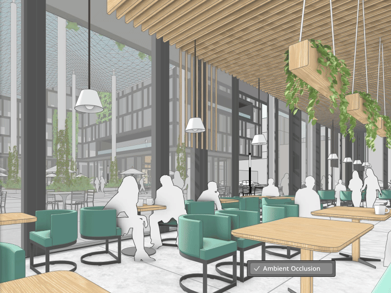 Ambient occlusion je globální nastavení stylu, které lze zapnout z nabídky Pohled / Styl plochy / Ambient occlusion nebo na samostatném panelu Styly (Dialogová Okna / Výchozí zásobník / Styly na Windows nebo Okna / Styly na Mac OS) na záložce Upravit a druhé kostičce Nastavení ploch. Ve spodní části panelu je zatržítko Ambient occlusion a dva posuvníky dovolující uživatelsky nastavit Vzdálenost, tedy dosah efektu a jeho Intenzitu.