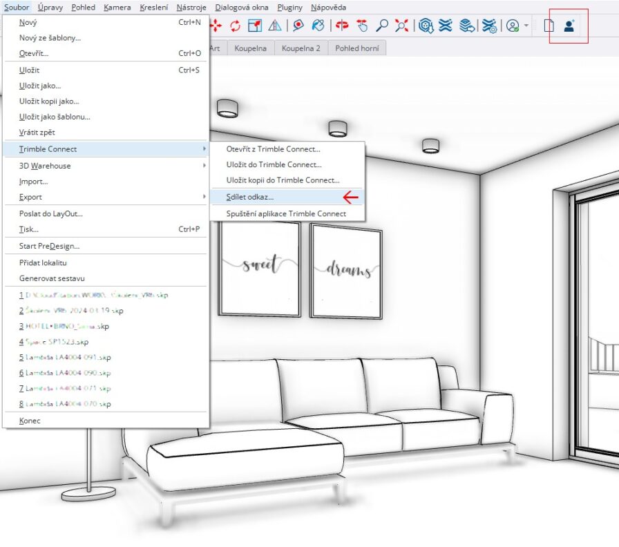 Rychlý tip! : Postup krok za krokem jak nasdílet vlastní SketchUp projekt klientovi nebo třeba spolupracujícímu řemeslníkovi naleznete podrobněji v samostatném článku: Sdílení projektu SketchUp pomocí Trimble Connect.