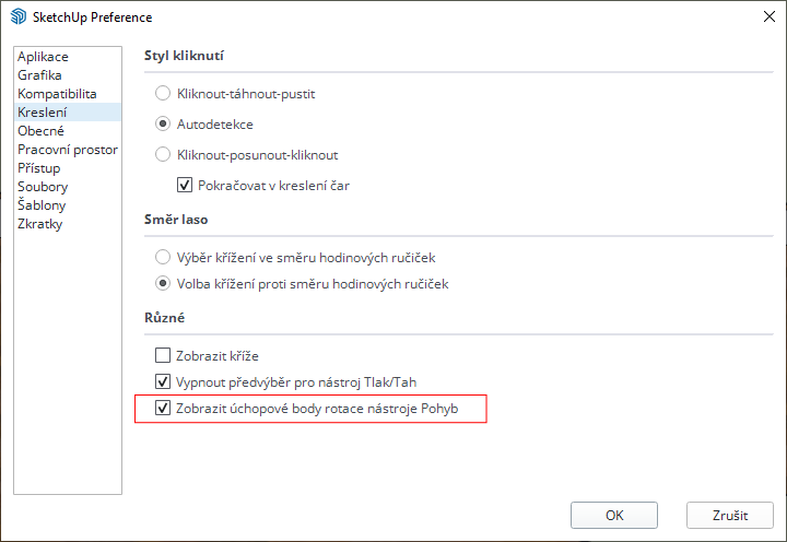 S možností přidávat do libovolné skupiny nebo komponenty své vlastní uchopovací body, tzv. Snapy, které byly představeny v aktualizaci SketchUp 2023.1 update se někdy může stát, že společně se základními rohovými úchopy a úchopy pro otáčení může být na vybraném objektu, se kterým se chystáte manipulovat pomocí nástroje Posun už přece jen více „šumu“ a nemusí být jednoduché trefit myší ten správný úchop. Chcete-li omezit tento vizuální šum a usnadnit navigaci nástroje Posun, je nyní k dispozici na panelu Preference v části Kreslení přepínač, který umožňuje Zobrazit nebo skrýt body, ty červené křížky, pro otáčení nástrojem Posun.