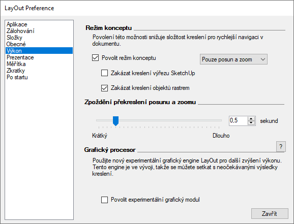 Nová položka Výkon v roletovém menu Úpravy / Preference nabízí možnosti, které Vám mohou pomoci upravit způsob, jakým LayOut zpracovává grafiku na obrazovce a zlepšit tak celkový výkon aplikace. Celkem dvě důležité funkce se nyní nacházejí na tomto panelu – Režim konceptu a nový experimentální grafický modul..
