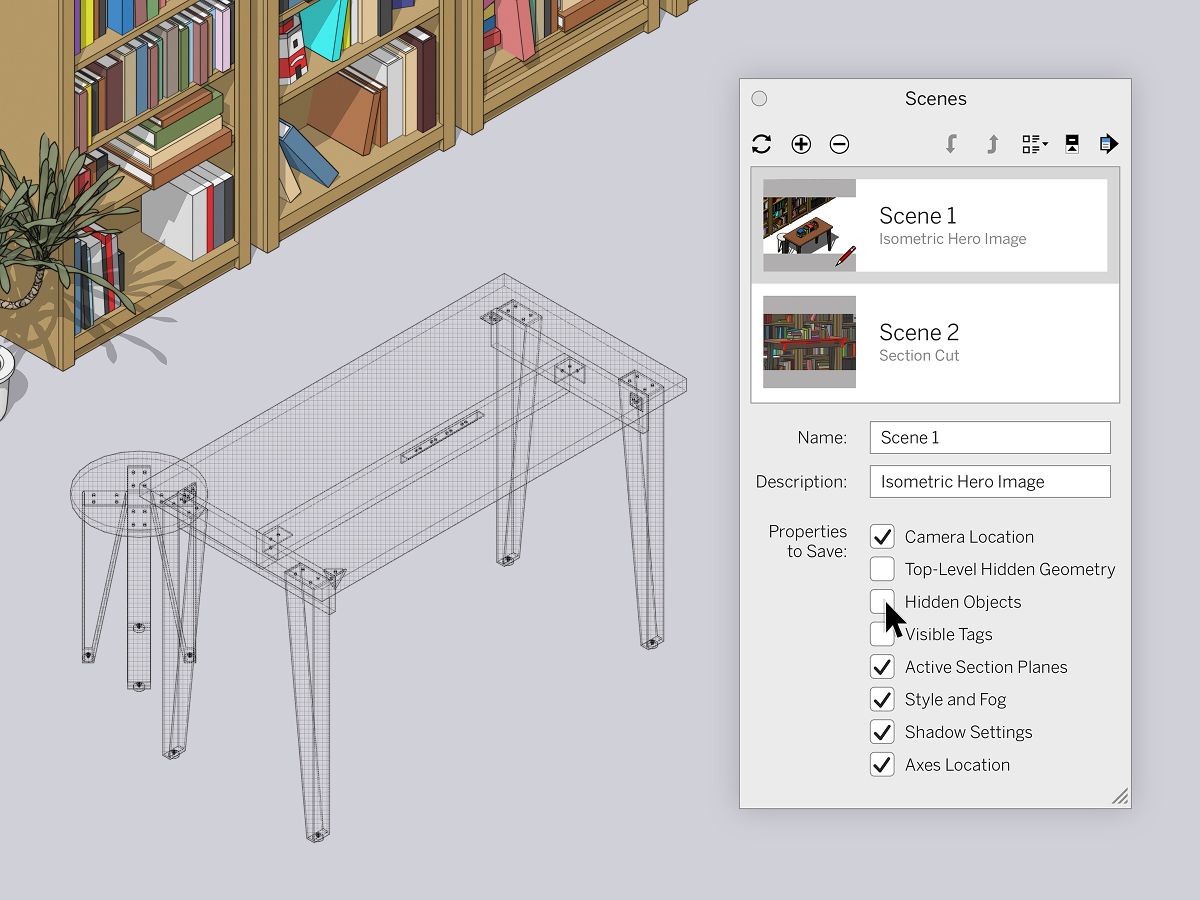 V novém update SketchUp 2020.1 můžete uložit viditelnost jednotlivé řezových rovin do scény i jako objekty. Protože řezové roviny mohou být vnořeny do skupin nebo komponent, chceme umožnit, aby se také chovaly jako tyto objekty. Před touto změnou bylo možné uložit pro každou scénu pouze viditelnost řezové roviny na nejvyšší úrovni. Přidaná hodnota tohoto vylepšení je opět větší kontrola v kompletní organizaci Vašeho modelu a konzistence principů napříč všemi funkcemi SketchUpu.