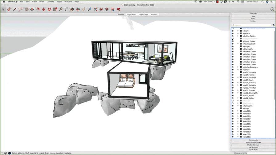 Hned první organizační změna se týká panelu Outliner (stromové okno objektů ve SketchUpu). Pro udržení pořádku ve Vašich mnohdy opravdu VELKÝCH projektech již nemusíte vytvářet velké množství hladin. Přesněji řečeno, nemusíte se spoléhat pouze na ně. Svůj model můžete řídit přímo v panelu Outliner. Pomocí intuitivní ikony oka (otevřené/zavřené = viditelná/skrytá geometrie) můžete přepínat stav jednotlivých objektů v projektu, ať už jsou to hlavní konstrukční části modelu nebo jednotlivé kusy nábytku. Řídit a organizovat takto můžete všechny své skupiny, komponenty i řezové roviny.