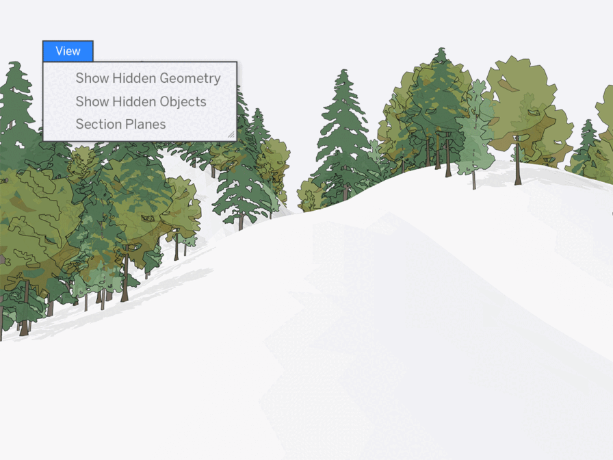 V rozbalovací nabídce horního roletového menu Pohled (View) si můžete všimnout, že jsme oddělili skryté objekty od skryté geometrie. A jak toto změní Vaše pracovní postupy? Poskytne Vám to možnost lépe spravovat skrytou geometrii a skryté objekty nezávisle na sobě pro ještě snadnější modelování. Řekněme například, že chcete upravit skryté hrany v exteriéru na vyhlazeném povrchu terénu, ale přesto chcete mít možnost skrýt objekty, které jsou v blízkosti (jako jsou stromy, keře nebo budova) …ano teď už toto můžete udělat!!