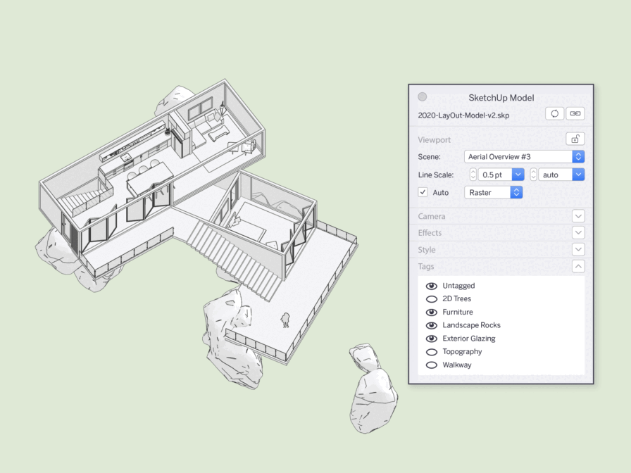 LayOut nyní mnohem více rozumí Vašemu modelu SketchUpu. To znamená, že můžete bez problémů změnit např. styl nebo úhel kamery přímo v LayOutu, aniž byste omylem ztratili změny (a to je výhra!)