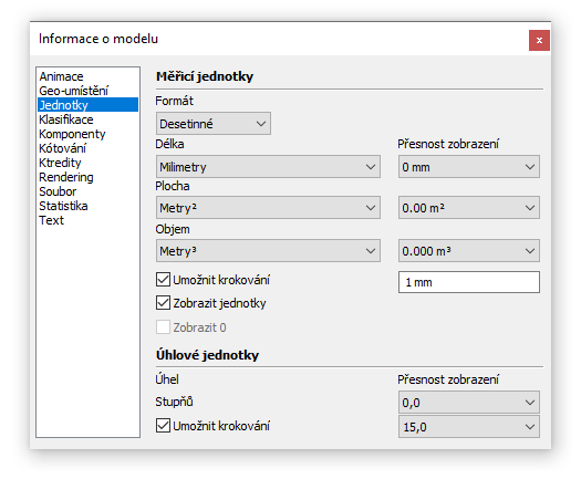– Na panelu Informace o modelu přibyly možnosti nastavit různou přesnost (počet desetinných míst) pro různé veličiny, např. Délky v milimetrech na 0 desetinných míst, Plochy v metrech čtverečních na 2 desetinná místa a Objemy v metrech krychlových s přesností na 3 desetinná místa.