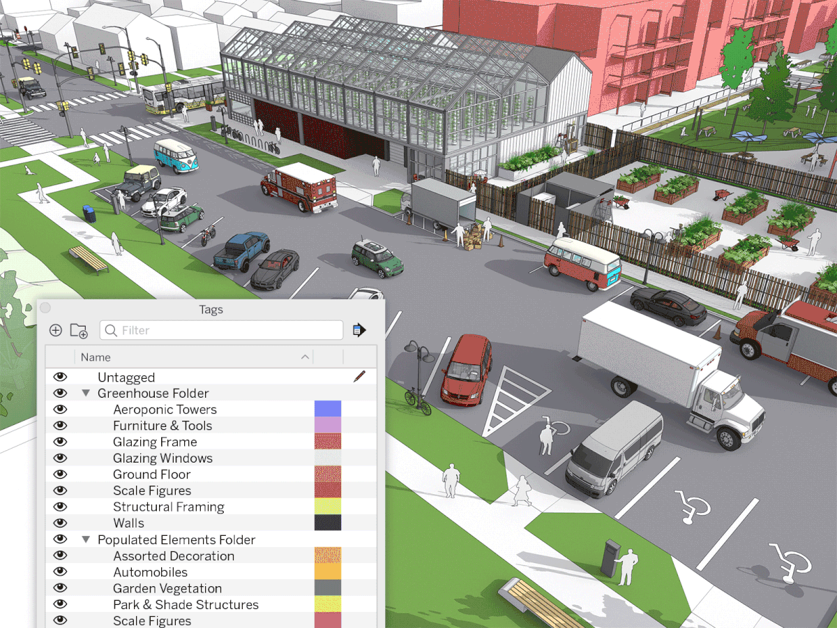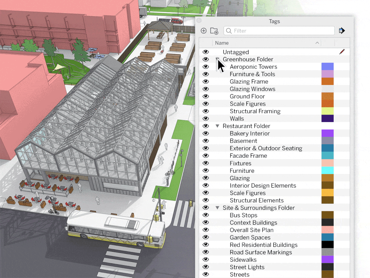 Ale tady se vývojáři naštěstí ještě nezastavili a představili novinku, která byla dlouho na seznamu přání uživatelů. Filtrování značek (dříve hladin) je ve SketchUpu konečně možné! Nyní bude mnohem snazší dohledat konkrétní Značku(y). Filtrování můžete využít také při vytváření Složek značek. Filtrovat můžete například i podle předpony nebo vlastní oblíbené konvence pojmenovávání Značek.