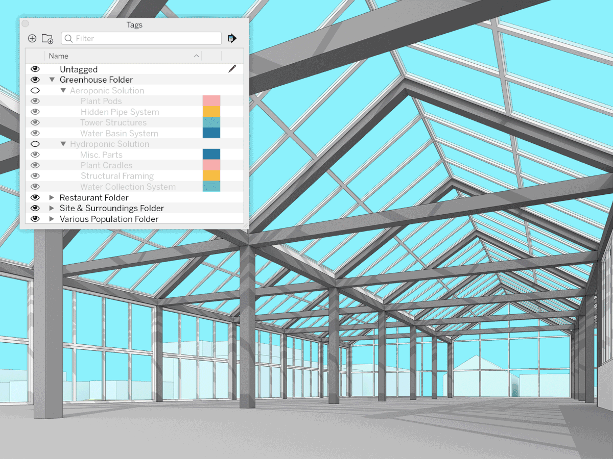 Složky značek je navíc možné řadit a strukturovat do podsložek. Tímto způsobem můžete řídit viditelnost všech značek ve složce najednou a můžete také najednou vybrat více Značek a Složek značek, abyste naráz zapnuli nebo vypnuli celé bloky Vašeho modelu!