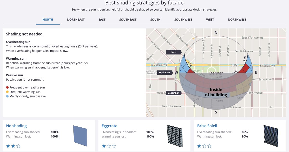 Intuitivní diagramy oslunění Vám pak ukazují místa dle orientace stavby vůči světovým stranám, které je například třeba více chránit před sluncem.