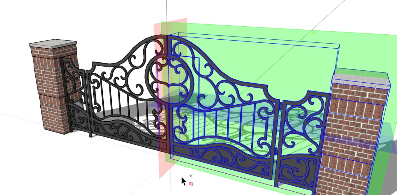 Roviny, které vidíte při aktivaci nástroje Převrátit, se orientují podle vnitřních os skupiny nebo komponenty, podobně jako u nástroje Zvětšení/Měřítko (Scale). Při výběru více objektů s různými orientacemi os budou roviny respektovat osy nadřazeného objektu (pokud existuje), případně globální osy celého modelu.