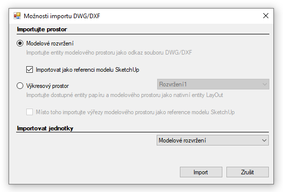 V LayOutu 2023 se *.dwg soubory importované do Vašeho dokumentu mohou stát spravovatelnými referencemi. Při importu stačí zaškrtnout políčko vedle položky Importovat jako referenci modelu SketchUp.