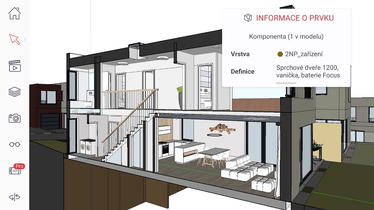 Pro ty co se SketchUpem sami už nějakou dobu pracují, zmíním jen telegraficky další možnosti, které mobilní SketchUp Viewer podporuje. Jsou to Styly zobrazení – od textur, přes skryté hrany, až po průhlednost. Případně hrany a roviny řezů, které je dokonce možné pomocí nástroje Výběr označit a dynamicky posouvat. Zachovány v modelu zůstávají i obsažené hladiny, zde Vrstvy, díky kterým je tak možné ovlivňovat během prezentace (ne)viditelnost jednotlivých částí ze kterých se projekt skládá.