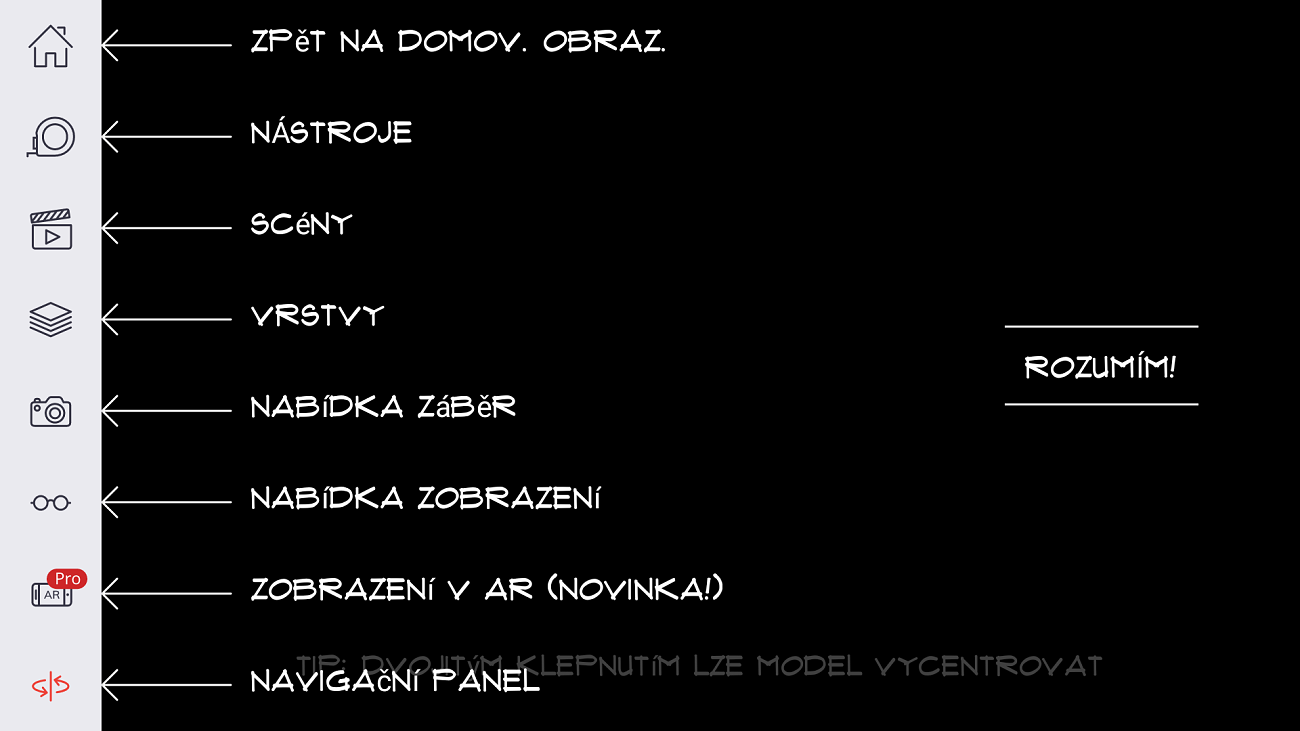 Modelem můžete otáčet, zoomovat, panoramovat pomocí známých multidotykových gest, podporovány jsou i funkce jako Pozice kamery, zde pojmenováno jako Nastavení záběru nebo sketchupový Pohled okolo, zde jako Rozhlížení. Samozřejmostí je možnost využití klasických přednastavených pohledů (Shora, Zepředu, Zleva, Zprava,… ) nebo uživatelsky uložených Scén v modelu. Podporováno je i spuštění animace, přepínání z perspektivy do paralelního zobrazení (Orto) nebo nastavení šířky zorného pole!