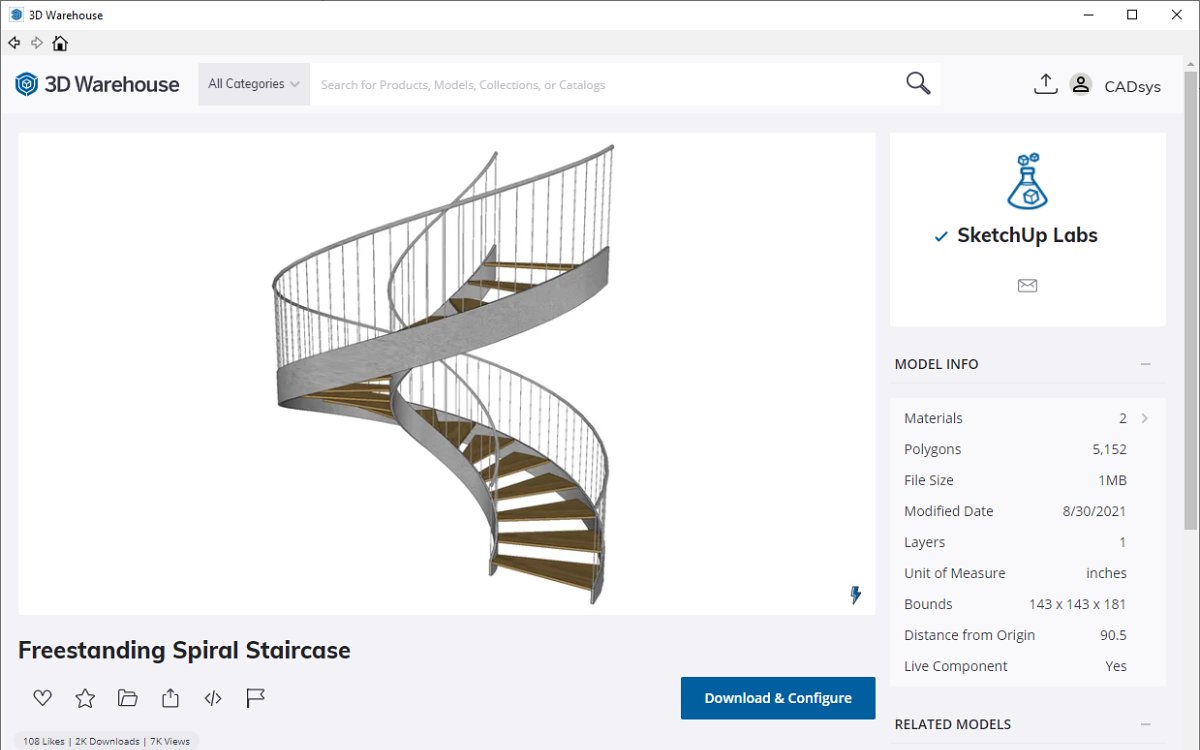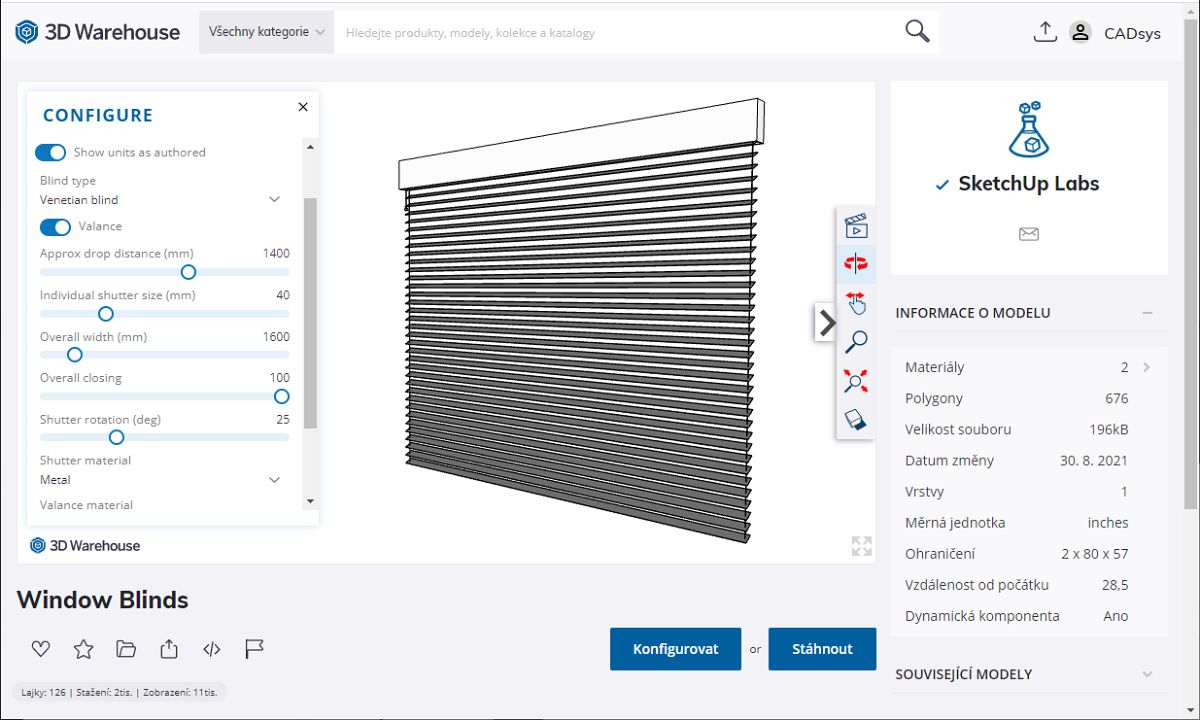 Pokud jste otevřeli okno 3D Warehouse přímo z prostředí SketchUp (buď příslušnou modrou ikonou nebo z horní roletové nabídky Dialogová okna / 3D Warehouse) a nalezli požadovanou Živou komponentu postupem uvedeným výše, kliknete na modré tlačítko Stáhnout a nakonfigurovat (Download & Configure) a model usadíte na požadované místo Vašeho projektu.