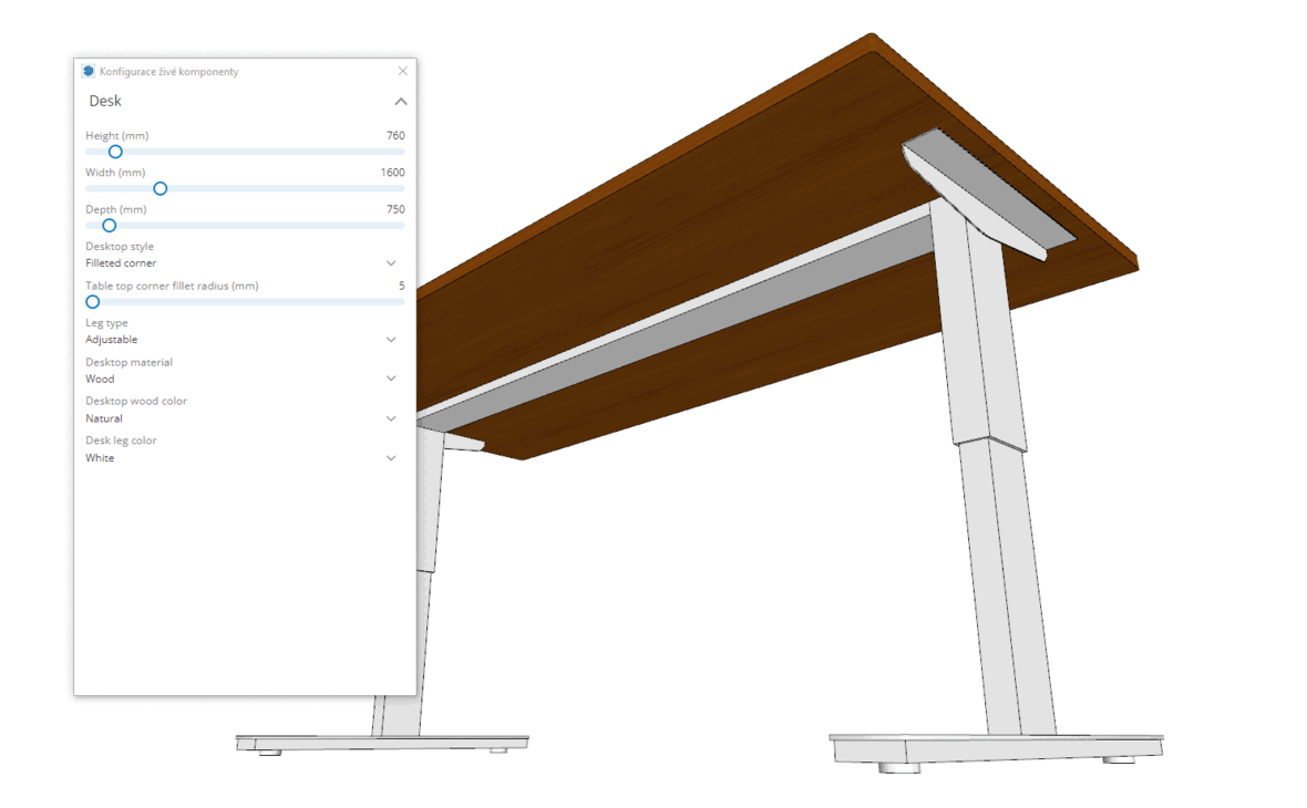 Hotové živé komponenty se často chovají jako docela chytré komponenty, když např. u níže uvedeného příkladu stolu po výměně typu nohou se s nastavováním rádiusu zaoblení rohů desky stolu automaticky posouvají nohy směrem do středu, aby jejich patky „nečouhaly“ mimo horní desku. 🙂