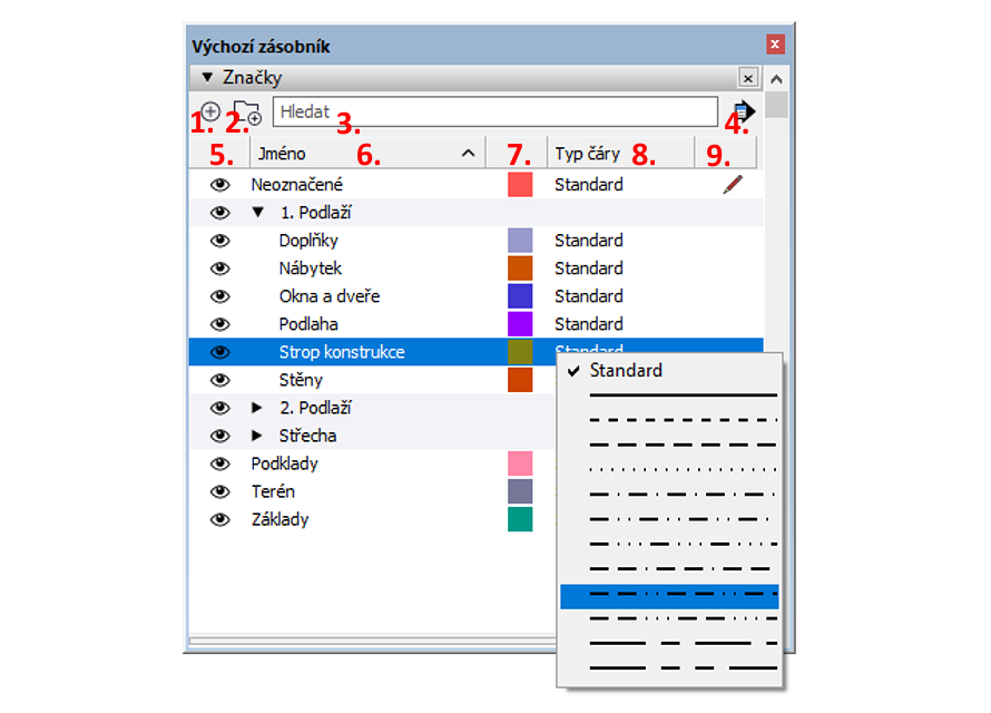 - Aktivní Značka / Hladina – značka označená symbolem tužky je ta, do které jsou umisťovány všechny aktuálně vytvářené nebo vkládané objekty či geometrie. Pokud nepatříte mezi pokročilé uživatele doporučujeme ponechat toto nastavení na výchozí značce Neoznačené.