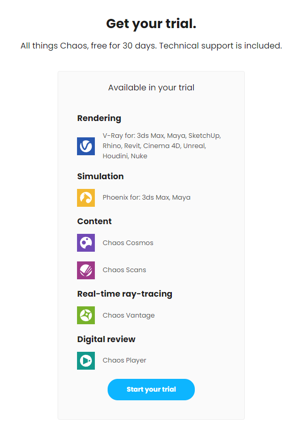- Vraťte se zpět na stránku www.chaos.com a po úspěšném přihlášení k právě vytvořenému účtu klikněte vpravo nahoře na tlačítko Try a na následující obrazovce na modré tlačítko Start your trial.