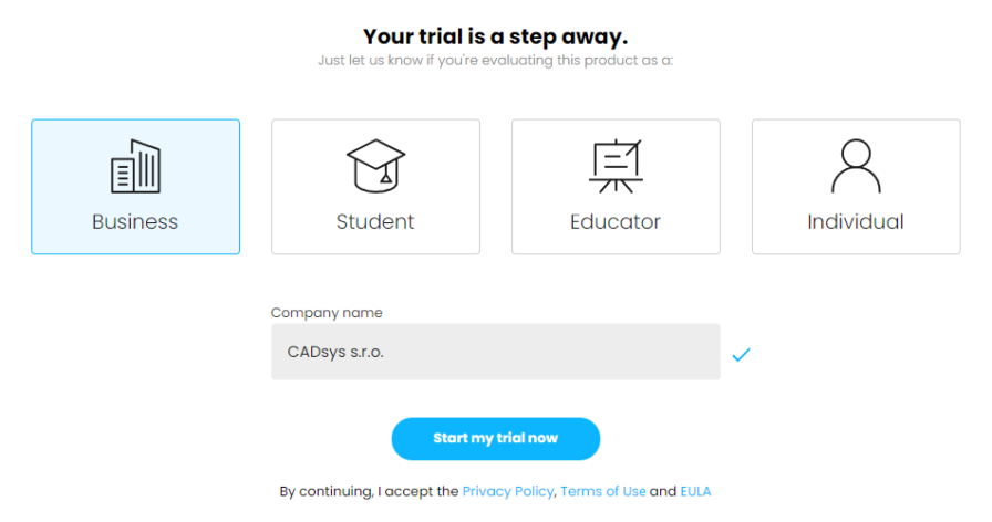 - Otevře se další stránka, na které už jen kliknutím na jednou z možností zvolíte za jakým účelem se chcete seznámit a případně následně používat V-Ray (Business, Student, atd.) a potvrdíte stisknutím modrého tlačítka Start my trial now.