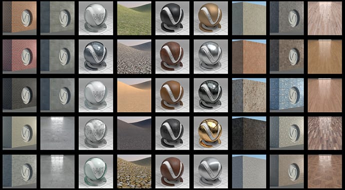 Populární knihovna materiálů V-Ray byla rozšířena a upgradována o ovládací prvky nových vrstev a funkce znáhodnění textury pro V-Ray 5, včetně kovů, skla, dřeva a dalších. Rozlišení textur bylo také zvýšeno až na 4K.