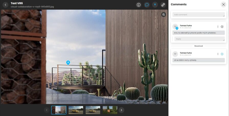 Sdílení výsledných renderů je s funkci Chaos Cloud Collaboration velmi snadné. Přímo z náhledového okna V-Ray Frame Buffer nyní můžete nahrát své rendery do cloudu a sdílet je s kýmkoli a odkudkoli. Podporovány jsou nejen obrázky ale i 360st. panoramata a díky možnostem chytrých komentářů získáváte rychlou zpětnou vazbu na jednom místě a zkracujete proces schválení a odsouhlasení.