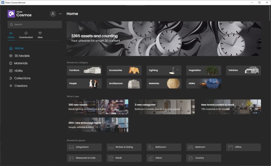 Vedle průběžně se rozšiřující „render-ready“ knihovny byla do Chaos Cosmos přidána i stávající knihovna materiálů V-Ray. Takže veškerý obsah, který pro práci potřebujete nyní najdete na jednom místě. Aktuálně čítá tato knihovna více než 5 700 kusů (3D modelů, materiálů, HDRI,…).
